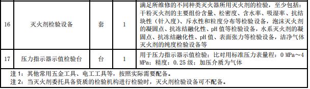 三級消防設施維護保養檢測設備用于滅火器的檢查、維修、更換滅火劑及回收,其設備配備的種類和數量至少應滿足表 3 的要求。