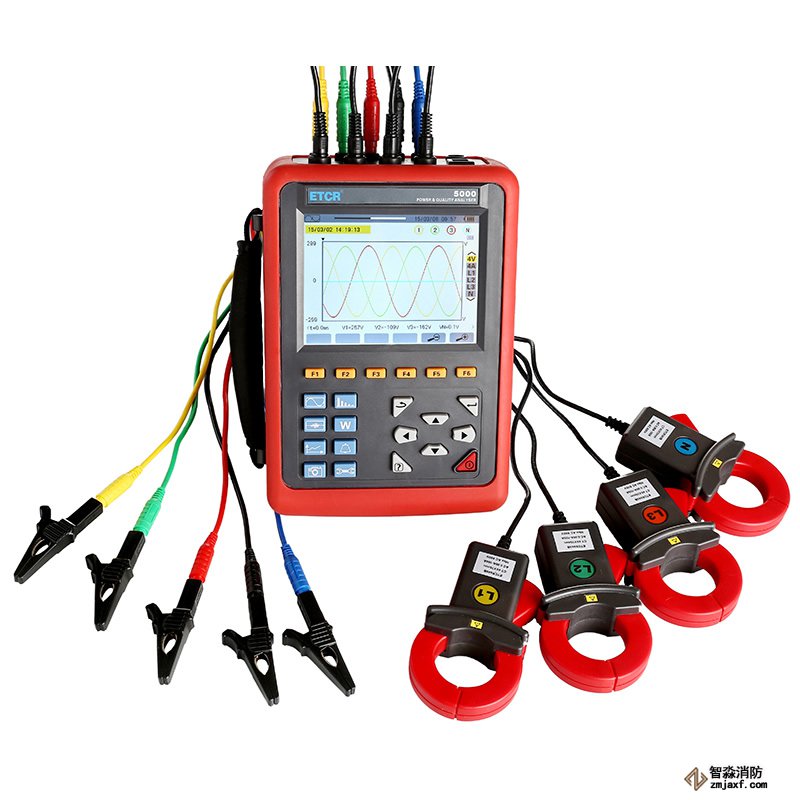 ETCR5000電能質量分析儀是我公司精心研制的一款專為現場測試的三相、多功能、智能化、人機操作簡潔的綜合型測試儀器。具有容易使用,超大液晶彩屏顯示,高分辨率,中英文雙語操作界面,防振結構外殼等特點。可同時測量4路電流(ABC三相及中性線電流),4路電壓(ABC三相電壓及中性線對地電壓)、電流電壓的峰值、一段時間內的蕞大蕞小值、三相不平衡度、短時電壓閃變、變壓器K因數、有功功率、無功功率、視在功率、功率因數、位移功率因數、有功電能、無功電能、視在電能、諧波比、總諧波失真度等;顯示電流電壓的實時波形、相量圖、諧波比柱形圖;動態捕捉電壓電流瞬時變化,監測啟動電流,監測各電力參數并生成告警列表,長時間記錄測試數據并生成趨勢曲線圖等功能。